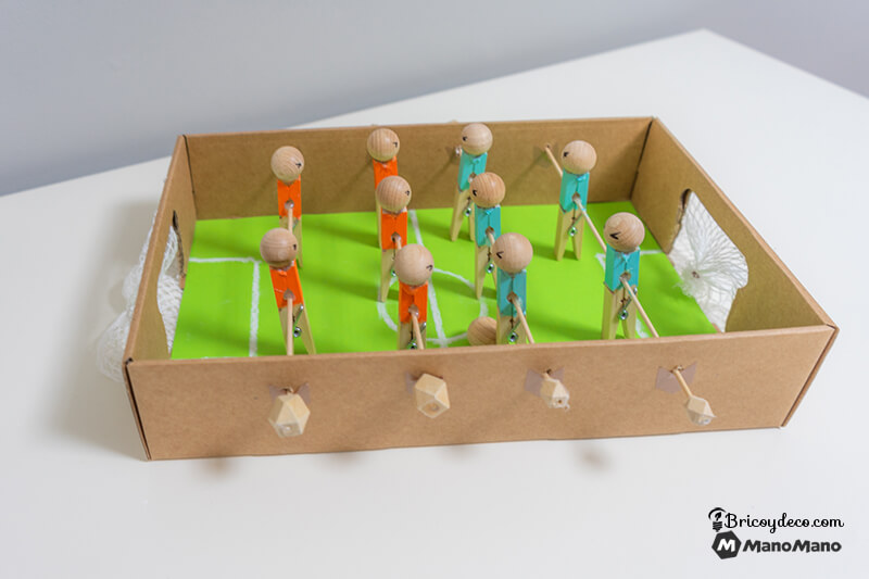Si buscas juegos fáciles para hacer con tus hijos, con una caja de cartón y pinzas de tender puedes hacer un futbolín para entretener tanto a pequeños como mayores. Podéis organizar vuestra propia liga y pasar horas y horas de diversión.